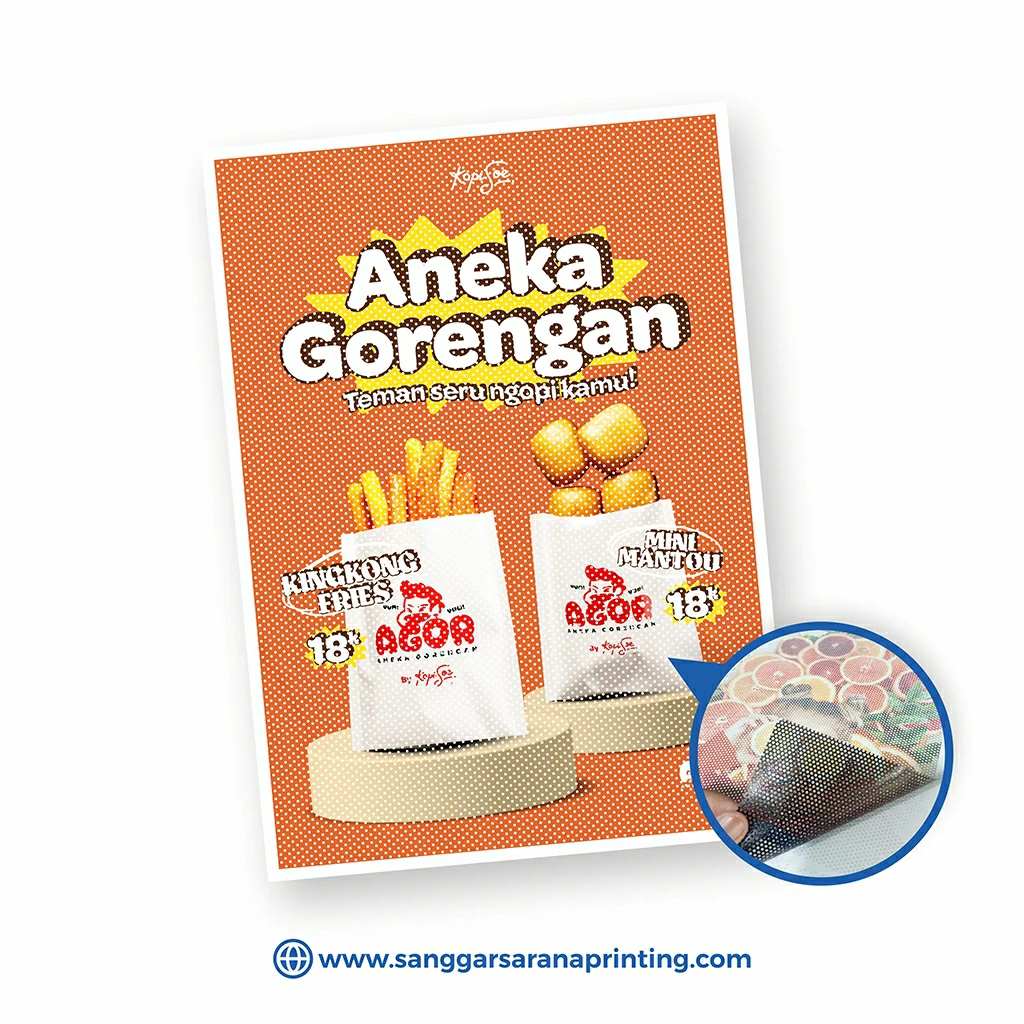 Sticker One Way biasanya digunakan untuk branding pada kaca pintu etalase, jendela kaca pada kantor-kantor /gedung, outlet atau kaca mobil. Yang unik dari sticker ini adalah bila kita melihat dari kejauhan, gambar akan tampak utuh tetapi jika dilihat jarak dekat akan nampak berlubang-lubang.
